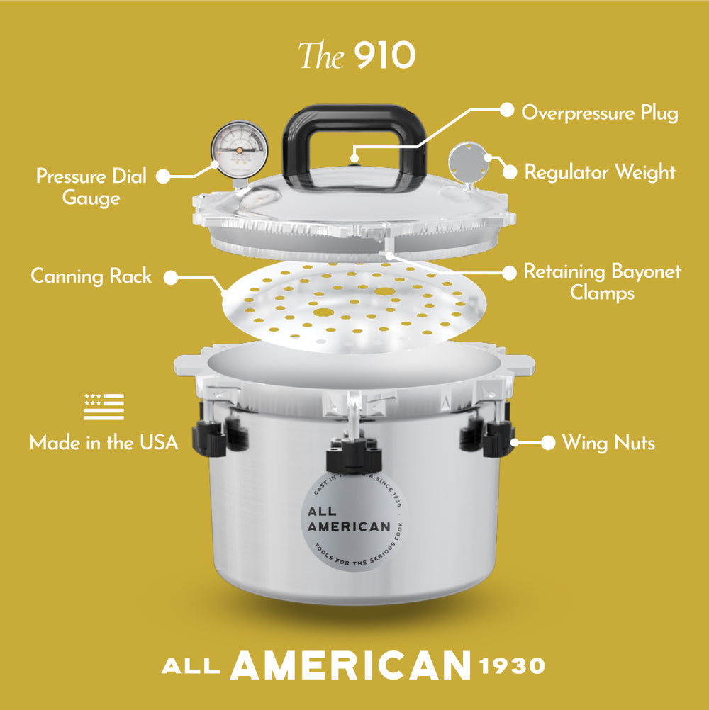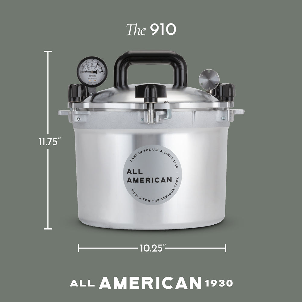The All American line of pressure canners offers the best and safest method for home canning. The U.S.D.A. recommends that pressure canning is the only way to can meat, fish, poultry and all vegetables. This unit has the capacity needed for preparing large quantities of food and pressure cooking inexpensive meat cuts to juicy tenderness in a short time. Only All American Pressure Canners feature an exclusive, precision machined "Metal-to-Metal" sealing system. Positive action clamping locks align the cover to the base forming a steam tight seal. Because no gasket is involved, the cover is always easily opened and closed.