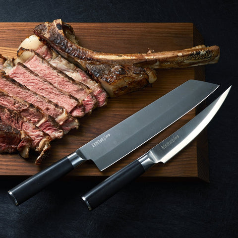 The single bevel Kiritsuke knife is ideal for slicing fish or for deft work with vegetables. Weighted and balanced for optimal handling it is light yet substantial, and robust yet razor sharp. The Honesuki boning knife is perfect for de-boning poultry, and is adept for other purposes such as filleting. It is thin, light and nimble, with a reverse tanto tip allowing for easy piercing and precise cuts.