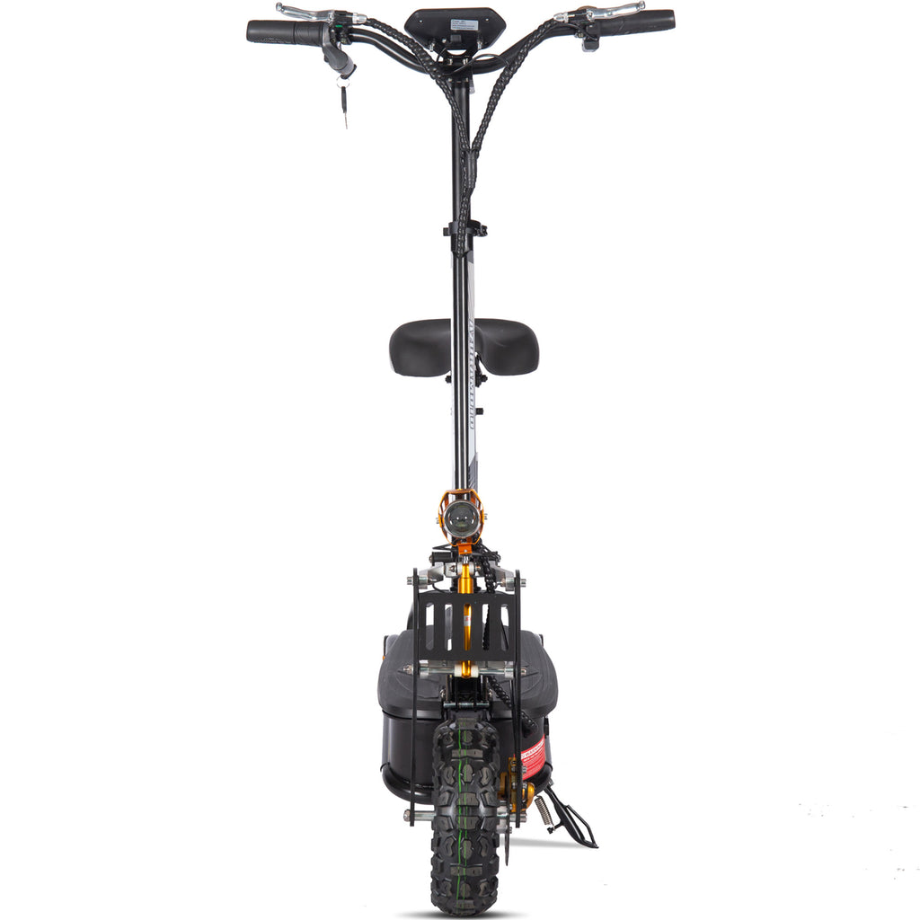 Introducing the new MotoTec Ares 48v 1600w Electric Scooter, foldable with removeable seat and a new modern design. Ergonomic shapes, headlight, LCD screen, front and rear suspension with big knobby tires give this scooter a lot of attitude. This top of the line model features a 1600 watt 48 volt motor with generous torque and performance, attributes that give it the power to tackle all types of terrain.