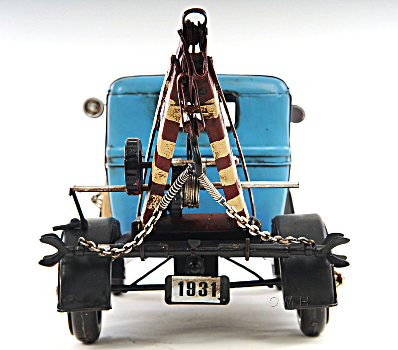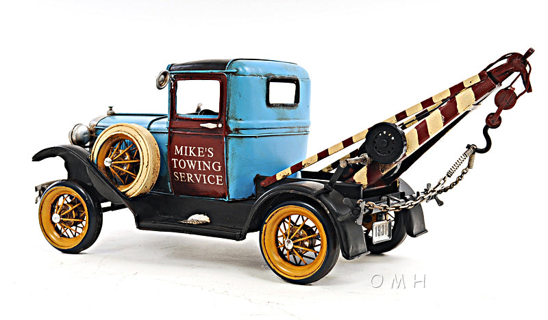 In March 1930, Ford Model A sales hit three million, and there were nine body styles available. One of them was the Ford Model A Tow Truck. Today, you can own this beautiful replica of the 1931 Ford Model A Tow Truck scale 1:12 in your home or office! Handcrafted of iron, with remarkable details such as spoke wheels, hood, headlights, fenders, and crane. A must for the collector and enthusiast!