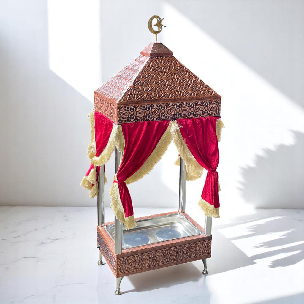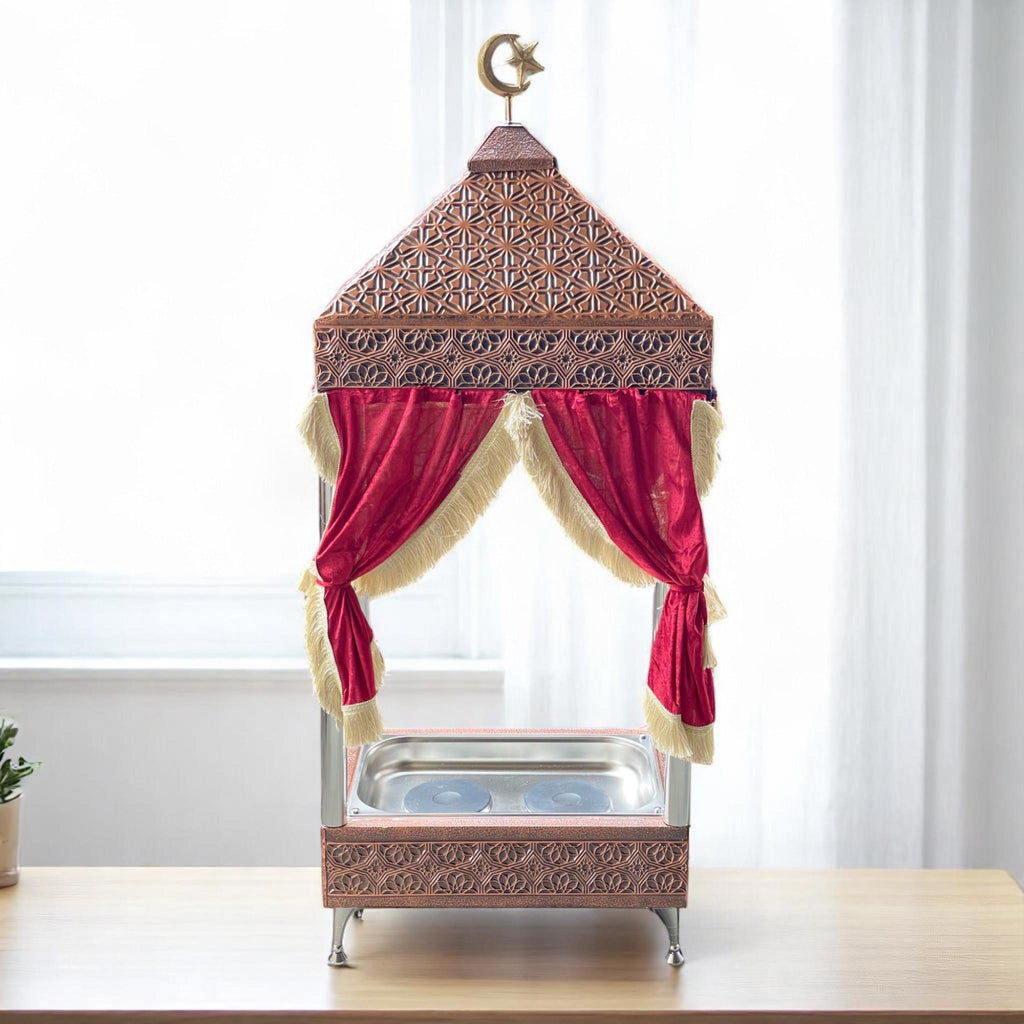 Enjoy the rich tradition of Turkish coffee with our Handcrafted, Hand-Hammered Copper Decorative Sand Coffee Maker — now in a majestic, tent-style design. Adorned with luxurious red velvet curtains and a traditional crescent moon ornament, this model is perfect for special occasions, cafés, or cultural events. Despite its ornate appearance, it retains the same power and performance you love — serving up to 30 people in just 5 minutes!